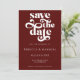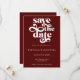 With a simple and modern design and retro typography, this elegant save-the-date announcement fits any wedding theme. It features a modern burgundy background and minimalist, and simple typography.