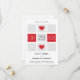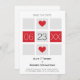 Modern checkerboard wedding save the date design in red and gray on a white background with striking hearts and an outstanding and striking date design.