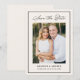 Introduce your wedding with this elegant photo save the date, designed with a soft ivory background for a warm and refined look. The design features “Save the Date” in black calligraphy at the top, with your vertical engagement photo centered to create a personal focal point. Your names, wedding date, and location are displayed below in clean, classic lettering, all framed by a thin black border for a timeless finish. This modern yet understated design is perfect for classic and contemporary weddings. The back is blank, allowing space for additional photos or wedding details.