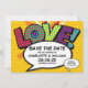 Un divertido, fresco y moderno libro de historietas retro inspirado en el arte pop salva la invitación a la cita que pone el wham, zap, pow en su invitación de citas boda. El reverso presenta un patrón de puntos polka de la historieta que se puede reemplazar con su propia imagen o foto. Diseñado por Thisisnotme©