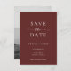 This wedding save the date card features a minimalist and modern style. The front has a clean Burgundy background with classic White typography, combining bold serif fonts with a touch of script for a refined look. The back showcases a black-and-white photo of the couple with text overlay, creating a romantic and timeless design.
