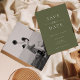 This wedding save the date card features a minimalist and modern style. The front has a clean Sage Green background with classic White typography, combining bold serif fonts with a touch of script for a refined look. The back showcases a black-and-white photo of the couple with text overlay, creating a romantic and timeless design.