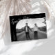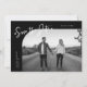 Modern and stylish save the date card featuring a hand lettered script text that says "save the date." One photo in the font and one on the back. The background is black.