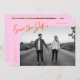 Modern and stylish save the date card featuring a hand lettered script text that says "save the date." One photo in the font and one on the back. The background is orange pink.