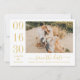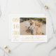 Bodas modernas y elegantes, excepto las tarjetas de invitación de fecha, incluyen una foto de compromiso horizontal con un diseño tipográfico que incluye números de fecha de boda audaces y elegantes con un simple monograma de los nombres de novias y novios. Color dorado y blanco.