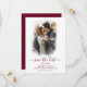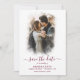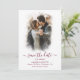 Elegante foto boda burdeos personalizada guarda las tarjetas de fecha con un moderno tipo de letra para complementar su romántica fiesta de bodas burdeos. Personaliza fácilmente en línea. Simplemente sube tu foto de compromiso favorita y escribe los detalles de tu boda usando nuestra plantilla moderna y crea unas bellas tarjetas para informar a tu familia y amigos sobre tu nueva aventura.