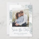 Este hermoso diseño incluye un código QR boda de fecha con el sitio web para más información, una foto simple ahorrada, un follaje verde azul polvoriento, una plantilla de diseño de imagen de 1 foto, una elegante y moderna foto atractiva de pareja, hojas de flores botánicas bodas, fotos de compromiso postal, con un guión moderno de pincel caligráfico, una tipografía moderna de moda minimalista caprichosa, escritura de calligrafía sencilla. guardar la fecha con la plantilla de elegantes rosas florales