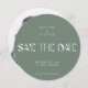 El moderno y elegante círculo tipográfico guarda la tarjeta de fecha con texto inspirado en el arte teco en el frente sobre un fondo verde sabio y tu imagen de elección en la parte posterior. Personalizar esta ronda guarda la tarjeta de fecha con su propia foto, nombres, fecha de boda y ubicación. Todos los colores (texto y fondo) también son personalizables. Cámbielo si desea ajustar su tema boda.