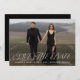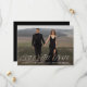 Único, elegante, salve la fecha con tu foto de compromiso horizontal de purga completa en la parte delantera de la tarjeta. "Save the Date" (Guardar la fecha) se muestra en un estilo tipográfico blanco y moderno: un guión caligráfico combinado con letras serif. Se proporciona un gradiente opcional para que la superposición del texto blanco se destaque de la foto. Personalice la parte delantera de la elegante foto y guarde la tarjeta de fecha con sus nombres, fecha de boda y ubicación. La parte posterior de la tarjeta muestra su sitio web boda o texto personalizado con letras blancas con un fondo negro (o color de su elección).