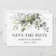 Moderna y elegante acuarela Invitación de compromiso Boda de la vegetación botánica Save The Date Card incluye hojas de eucalipto, follaje botánico verde, polvorientas hojas azules y otros hermosos paisajes botánicos.