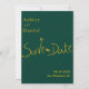 Esta elegante boda verde y dorada, en la que se ha guardado la fecha, es perfecta para un boda moderno. el diseño es sencillo, con una elegante caligrafía dorada sobre un fondo verde.