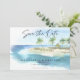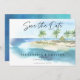 Moderna secuencia de comandos de Ocean Beach Tropical Ahorre la Invitación de Boda del anuncio de fecha - Anuncie su fecha boda con nuestra elegante invitación de invitación a la playa acuarela con un hermoso paisaje acuático tropical de playa. Una cálida playa de arena con agua turquesa y palmeras decoradas con luces de cuerda con tipografía de escritura moderna. Incluye el código QR para que el personalizar se realice con la url del sitio web del boda.