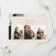 moderno guión de caligrafía para boda Save the Date de colaje de 4 fotos. Esta elegante tarjeta incluye un collage de 3 fotos en la parte frontal y 1 en la parte trasera con texto personalizado y fondo.collage