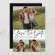 Con tres fotos y un guión moderno escrito "salva la fecha" en negro sobre fondo blanco, esta tarjeta es la manera perfecta de anunciar tu compromiso y tu próximo boda a amigos y familiares. El texto negro es audaz y moderno, pero aun así sofisticado. El texto del personalizable en la parte delantera tiene espacio para nombres, fecha, ubicación y otra información como un sitio web boda. La parte trasera es un negro a juego con una espinilla blanca estrellada. Más colores y estilos de este original, excepto la fecha de Lea Delaveris Design se puede encontrar en la colección.