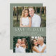 Elegante, multifoto guardar la fecha con "Save the Date" mostrada con letras blancas con un fondo verde sabio. Personalice el QR moderno para guardar la tarjeta de fecha con 3 de sus fotos favoritas, sus nombres, fecha de boda y ubicación del boda. El color verde sabio guarda la fecha se invierte para mostrar el código QR de su personalizado con el sitio web boda y el texto personalizado.