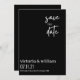 difunde la gran noticia de tu boda con esta tarjeta moderna para guardar la fecha, en negro elegante y con texto blanco