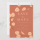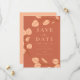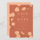 Elegante eucalipto Minimalista sale en melocotón con detalles de arte de la línea naranja oscura en una boda de fondo de terracota naranja, salven la fecha. Guión de tipografía moderno personalizado con plantillas fáciles de usar. Una moda simple y bonita línea de vegetación de eucalipto simplista en una simple boda de diseño de estilo de corona salvará la invitación de fecha disponible impresa y como descargable digital. Decoración original de terracota de vegetación botánica y tonos de sol, obra de la artista Catherine Sweetman, ideal para una boda de primavera, verano, otoño o invierno.