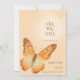 Simple. Moderno. Elegante. Hermosa invitación de guardar la fecha de boda de la mariposa monarca naranja con foto en el reverso de la invitación. Esta invitación de boda cuenta con una ilustración de acuarela de una mariposa serena volando hacia un sol que estalla con rayos de sol. Hay hermosos tonos de naranja apagado, marrón y crema. Edite el reverso de esta tarjeta con una foto de la pareja comprometida.