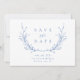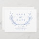 Elegantes hojas botánicas ilustradas a mano a mano escudo con escritura moderna a la moda y fuente clásica en azul y blanco, simple y sofisticado. Excelente ahorre las tarjetas de fecha para la moderna boda clásica, boda formal simple, elegante boda botánica en el jardín. Ver todas las piezas coincidentes de la colección