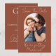 Celebra tu historia de amor con estilo con nuestro Ahorra la Fecha con Monograma de Foto de Terracota con Letra Moderna. Con un cálido fondo de terracota, letra elegante y fluida, y un monograma personalizado, este diseño combina el minimalismo contemporáneo con un encanto romántico. Muestra tu foto favorita en un diseño limpio y moderno que destaca tus nombres, fecha de boda y la alegría que compartes mientras te preparas para decir "sí".
