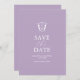 Anuncie su compromiso con este monograma de boda guarde las invitaciones de fecha. Presentan las iniciales monogramadas de la novia y el novio en un elegante escudo sobre un sólido fondo de color lila. Utilice los campos de plantilla para agregar el texto personalizado. Una elección elegante para bodas y duchas de novias. Para ver la suite completa de invitación a la boda, visite www.zazzle.com/dotellabelle