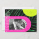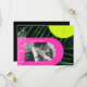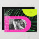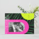 Arcos rosados y amarillos de neón sobre fondo de hojas de palma oscuras con monograma vertical en la parte superior derecha y en la parte izquierda de la hoja de palma de arte de línea blanca. Personalice el texto y la foto en blanco.