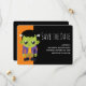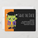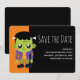 Tarjeta para guardar la fecha con una divertida imagen de Halloween con un monstruo de Frankenstein verde.