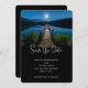 Tarjeta de guardar la fecha con una hermosa fotografía de un muelle de madera que se extiende sobre un lago tranquilo. Cielo nocturno cubierto de estrellas y una hermosa luna llena.