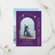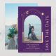 Mystical Purple Gold Sun Moon Stars Space Galaxy Celestial Cosmos Astronomía Save The Dates cuenta con un sol dorado, luna y estrellas enmarcadas en un fondo morado. Adentro está tu foto favorita y tu personalizado guarda la información de la fecha. Añadir una foto adicional al reverso. Personalice editando el texto en los cuadros de texto. Diseñado para usted por ©2022 Evco Studio www.zazzle.com/store/evcostudio
