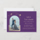 El Mystical Purple Gold Sun Moon Stars Space Save The Dates presenta un sol dorado, luna y estrellas enmarcadas en un fondo morado. Adentro está tu foto favorita y tu personalizado guarda la información de la fecha. Personalice editando el texto en los cuadros de texto. Diseñado para usted por ©2022 Evco Studio www.zazzle.com/store/evcostudio
