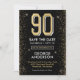 Esta fabulosa fiesta de cumpleaños número 90 de los hombres de oro y negro Salven la tarjeta de fecha con el número 90 en oro con fuentes modernas y lados purpurinas de oro sería perfecta para pedirle a la gente que ponga esta fecha especial a un lado para el hombre en la próxima fiesta de cumpleaños número 90 de tu vida. Es tradicional y clásico, fresco, moderno y contemporáneo. Para ver su tarjeta única guardar las tarjetas de fecha seleccione "Personalizar esta plantilla" y escriba su información. ¡Es muy fácil!
