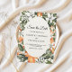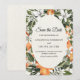 Traiga un estallido fresco de color y encanto a sus anuncios de boda con esta tarjeta de 'Save the Date' floral naranja de moda. Con delicadas flores blancas y acentos de cítricos de acuarela alrededor de un marco oval suave de color blanco desvanecido, es la elección perfecta para bodas rústicas, mediterráneas, de verano o boho. Totalmente personalizable con sus nombres, fecha y ubicación para crear un recuerdo que sus invitados amarán.
