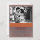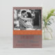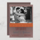 Nada dice otoño como naranja quemado y marrón. Estos colores son un emparejamiento perfecto para una boda en otoño. La tarjeta plana Save the Date está diseñada para incluir una foto de la pareja feliz enmarcada por un overlay marrón. El marco marrón tiene una textura granulada. Una cinta naranja quemada separa la imagen de arriba de los detalles de abajo. La cinta incluye un patrón de líneas rojas, sabias y azules cruzando entre sí.