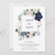 Esta elegante tarjeta de guardar la fecha de la boda presenta un marco de flores de acuarela de color azul marino, azul claro y rosa con hojas verdes y beige neutro. La parte trasera de la tarjeta presenta rayas azules náuticas y blancas.