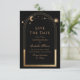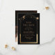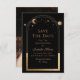 Celestial Black Save The Date Birthday Quinceanera Invitation presenta un sol dorado, luna y estrellas enmarcadas en un fondo negro. Adentro está su personalizado Quinceanera guardar la información de fecha y al revés agregar su foto favorita. Personalice editando el texto en los cuadros de texto. Diseñado para usted por ©2024 Evco Studio www.zazzle.com/store/evcostudio