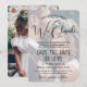 Anuncia las alegres noticias de tu fiesta posterior al escape con la exclusiva superposición de fotos personalizadas "¡Nos queremos, nos casamos, nos fugamos!" en las invitaciones de "guarda la fecha". Todo el texto es fácil de personalizar para cualquier tipo de celebración, como una recepción de boda solamente, ceremonia de renovación de votos, boda secuela o fiesta de primer aniversario. Incluye la fecha de la boda, ubicación, sitio web o cualquier otro detalle importante que desees. (CONSEJO PARA COLOCAR IMÁGENES: Una forma fácil de centrar una foto exactamente como la deseas es recortarla antes de subirla al sitio web de Zazzle.) El elegante diseño en blanco y negro presenta dos imágenes de la pareja recién casada, caligrafía moderna y trendy con letra manuscrita, y tipografía de máquina de escribir con estilo. ¡Felicidades a la novia y al novio!