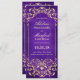 Estos anuncios de boda para guardar la fecha, elegantemente delgados y en tonos deslumbrantes de oro pálido resplandeciente y púrpura berenjena suntuosa, son una mezcla de buen gusto de sensibilidades Art Nouveau y Victorianas, con un marco sofisticado de hermosos giros y delicados trabajos de volutas, y texto clásico con fuentes serif y de bloque. El texto de respuesta de la boda es completamente personalizable. Personalice la parte trasera con su fecha de respuesta.