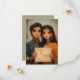 ilustracion de un novio y novia indio sosteniendo un papel en blanco en sus manos, usando ropa tradicional. La mujer tiene el pelo largo negro con los ojos marrones, mientras que el hombre es guapo con el pelo oscuro corto y los ojos avellanados. Ambas tienen intrincadas joyas en la cabeza y llevan bordados florales naranjas.
