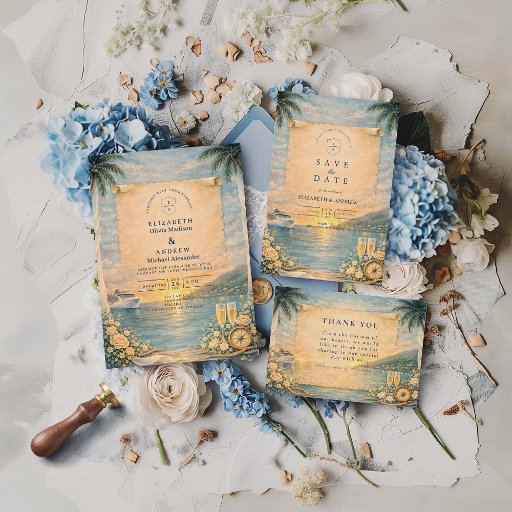 Celebrate your love story with a timeless cruise-inspired wedding design, perfect for couples exchanging vows at sea or dreaming of an elegant nautical setting. The soft sunset tones and classic layout create a romantic atmosphere ideal for formal, destination, or ocean-themed ceremonies. Fully customizable with your names, date, and event details, this design is suited for cruise weddings, seaside venues, or elegant destination celebrations.
