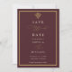 Elegant old money burgundy save the date card with gold accents and classic serif typography. Editable in the Zazzle editor.