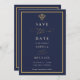 Elegant old money navy blue save the date card with gold accents and classic serif typography. Editable in the Zazzle editor.