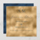 Monogramas de hermosa novia y novio en la parte superior de esta hermosa tarjeta de aviso de boda. Fondo de oro falso con fuente azul profundo para coordinar con la parte posterior azul desgastada de esta elegante invitación. Absolutamente impresionante.