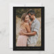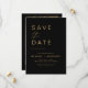 Tarjetas de guardar la fecha de boda elegantes negras y doradas que tienen una foto en la parte frontal. Las tarjetas de guardar la fecha contienen una tipografía moderna de letra cursiva manuscrita que es elegante, simple y moderna para usar después de su celebración de boda minimalista simple.