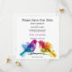 Presentamos la Boda "Aves Amantes del Arcoiris" ¡Salven la Tarjeta de Fecha! El frente de esta tarjeta cuadrada presenta una cautivadora obra de arte acuática de dos intrincadamente representadas aves enfrentadas entre sí en medio de los vivos colores de la bandera del orgullo LGBTQ+. Estos pájaros simbolizan unidad, amor e inclusividad, creando un impresionante punto focal contra el sereno fondo blanco. A la derecha, los nombres de la pareja y la fecha de su boda se muestran con elegancia, asegurando que los clientes sepan cuándo marcar sus calendarios. A continuación se indica la ubicación del lugar, lo que garantiza a los huéspedes toda la información necesaria. Una solicitud de personalizable añade un toque personal, en el que la pareja puede incluir peticiones o detalles específicos para sus huéspedes. La parte posterior de la tarjeta presenta la misma obra de arte cautivadora de los pájaros con el fondo blanco sereno, proporcionando un diseño cohesivo y visualmente atractivo. Debajo de la obra, hay un espacio para un mensaje personalizado de la pareja. Esto podría ser una nota de gratitud sincera, un recuerdo especial o cualquier otro mensaje que la pareja desee transmitir a sus invitados. También se incluyen los nombres de la pareja, asegurándose de que la invitación sea de ellos. Además, hay información sobre la siguiente invitación, construyendo anticipación para lo que vendrá. Por último, hay disponible una línea adicional para cualquier mensaje adicional, como una dirección web boda o cualquier otra información importante que la pareja quiera compartir. En general, la carta de matrimonio "Amantes del Arcoiris" Save the Date es una elección impresionante y elegante para las parejas que quieren invitar a sus invitados a presenciar y celebrar su día especial. Con su cautivadora obra de arte, su espacio de texto en personalizable y su espacio para un mensaje personalizado, esta tarjeta garantiza que los huéspedes tengan toda la información necesaria, además de proporcionar un toque personal a la pareja.