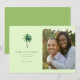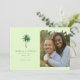 Esta invitación de guardar la fecha de la boda presenta un diseño de página dividida con un fondo verde claro en un lado, que muestra una ilustración detallada de una palmera. El otro lado incluye un marcador de posición para una foto cálida y con enfoque suave de dos personas abrazándose, lo que sugiere un momento íntimo. El diseño emplea fuentes serif clásicas para un toque refinado y utiliza una paleta de colores suaves para crear un tema tropical y elegante. Perfecto para transmitir calidez y alegría, esta plantilla es ideal para parejas que celebran su unión en un entorno sereno.