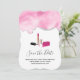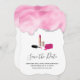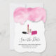 Guarde la tarjeta de fecha con un diseño de estilo glam. Palo de labio rosado y esmalte de uñas. La botella de esmalte de uñas está abierta, tendida a su lado, con una gota de esmalte de uñas saliendo. El borde superior está decorado con un color rosa purpurinoso y un forro falso purpurina plateado.