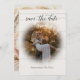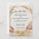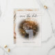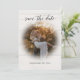 "Pampas Grass Rustic Wood Script Typography Photo Save the Date." Tu foto de compromiso con un suave fondo de tablero de madera pintado de blanco y "guardar la fecha" en un estilo tipográfico manuscrito. En el reverso se encuentra una corona de paja al estilo bohemio BOHO de pampas y vegetación de palmeras secas naturales pintadas con acuarela por la artista y diseñadora con licencia internacional Audrey Jeanne Roberts, copyright.