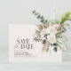 Moderna casa de campo rústica de pampas botánicas botánicas naturales pampas y bodas botánicas eucaliptos salvan la invitación de fecha. Elegante verde salado , terracota, color negro y natural. Espacio para sitio web y código QR en la parte posterior.