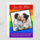 Esta tarjeta de anuncio de Save the Date arcoíris negrita presenta una foto de compromiso romántico personalizada de pareja LGBTQ para una pareja gay o lesbiana que ama los anuncios brillantes y coloridos. Personalice esta alegre tarjeta de fotografía de Save the Date LGBT con sus nombres, fecha y ubicación.