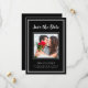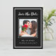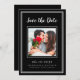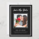 Moderno y simple Save The Date Photo frame design presenta tu foto de compromiso cuadrado favorita enmarcada por un marco cuadrado blanco y nítido sobre un fondo negro clásico. Personalice y comparta sus detalles de compromiso y boda con sus invitados en letras blancas y escritura nítidas. El diseño se completa con un moderno marco doble en blanco. El dorso de la tarjeta es negro sólido. (Para la mejor ubicación de la imagen, utilice una herramienta de edición de fotos para centrar y recortar ANTES de subir al sitio web de Zazzle.) Póngase en contacto con invitationsuites@gmail.com o utilice la función de mensaje con preguntas o solicitudes de color personalizado.